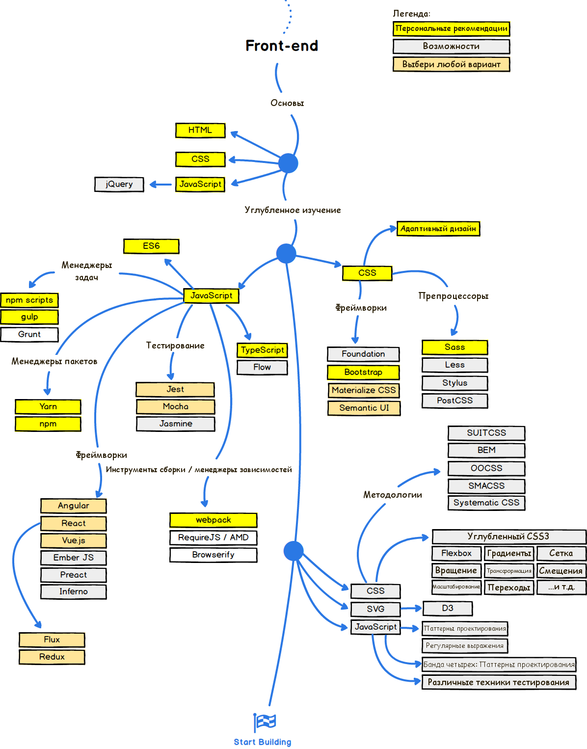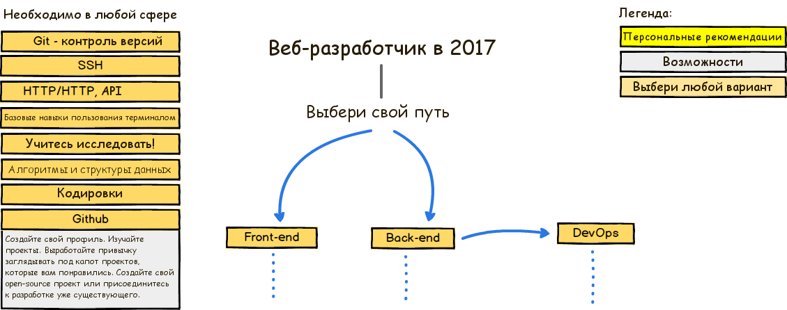 Яркая инфографика о путях развития современного веб-разработчика и технологиях, которые ему необходимо изучить, чтобы стать фронтендером, бэкендером или devops в 2017.