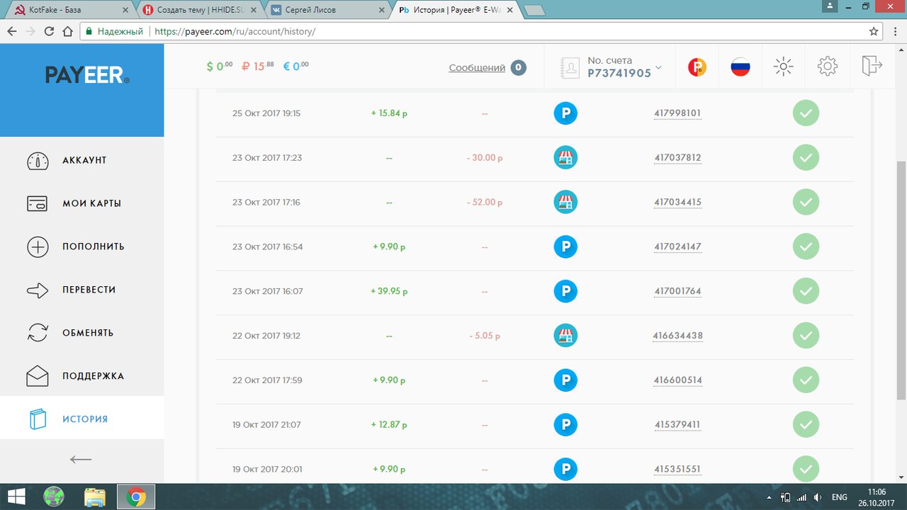 Всем доброго времени форумчане. Я расскажу как заработать хоть какие то деньги если у кого то не получается или кто то начинает. Все уже слышали про сайт kotfake или что то наподобии него. Но я пользуюсь им. В общем я расскажу про него и способ. Нам требуется вложение именно руб 100. Покупаем вип дешевый по тарифу 100 руб(эти деньги малые и не жалко) на 14 дней. Купили. Далее нам не нужно никого ломать. У нас есть доступ к базе. Далее мы просто чекаем и обновляем базу. Будем работать с акками вк. Берем акк вк из базы. Идем на сайты фаст лото, випмоней, фаст-вин. Я пользуюсь 3-мя сайтами. Берем акк с фейка, заходим на него и быстро(именно быстро) по всем рулеткам что у нас открыты входим через вк. И на каждом сайте дают по 2 руб. Ставим ставку (я ставлю сразу 2р) так как в базу котфейка может прилететь еще акк. Повезло выиграли руб 10 например сразу выводим. (я вывожу на пауеер). Только не заигрывайтесь скажу! выиграли выводите. На 1 акке по 3 сайтам можно руб 100 поднять и это при том как повезет. В день особенно во второй половине дня можно вип окупить. Да и еще в плюс уйти. Таким способом я зарабатывал на суши заказ. После обеда начну вечером закончу. Руб 800 подниму. На след день проем))) Всем удачи. Думаю годно. Скину пруф выплат на всякий случай с 1 акка.