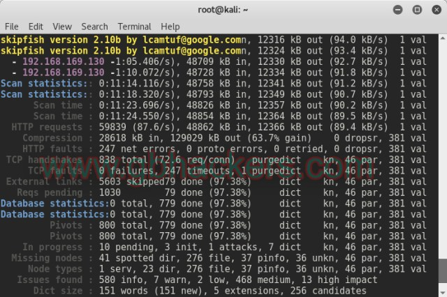 root@kali:~# skipfish -d -o 202 http://192.168.169.130/