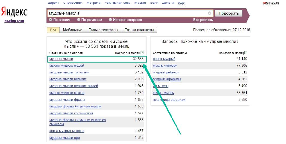 Давайте теперь посмотрим в вордстате сколько показов в месяц имеет фраза «Мудрые мысли»