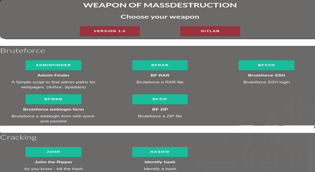 Это python инструмент с набором программного обеспечения для IT безопасности. Программное обеспечение инкапсулировано в «модулях» Модули состоят из чистого кода на Python и / или из внешних третьих программ.